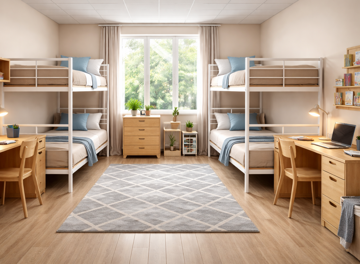 Space-efficient and robust hostel furniture designed for high-usage residential environments, ensuring comfort, durability, and functionality.